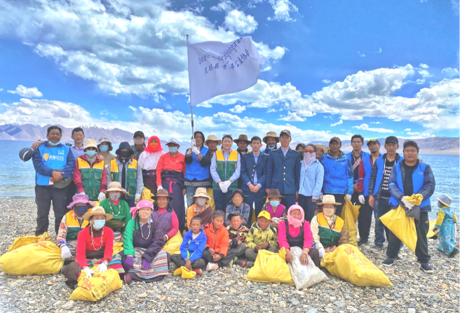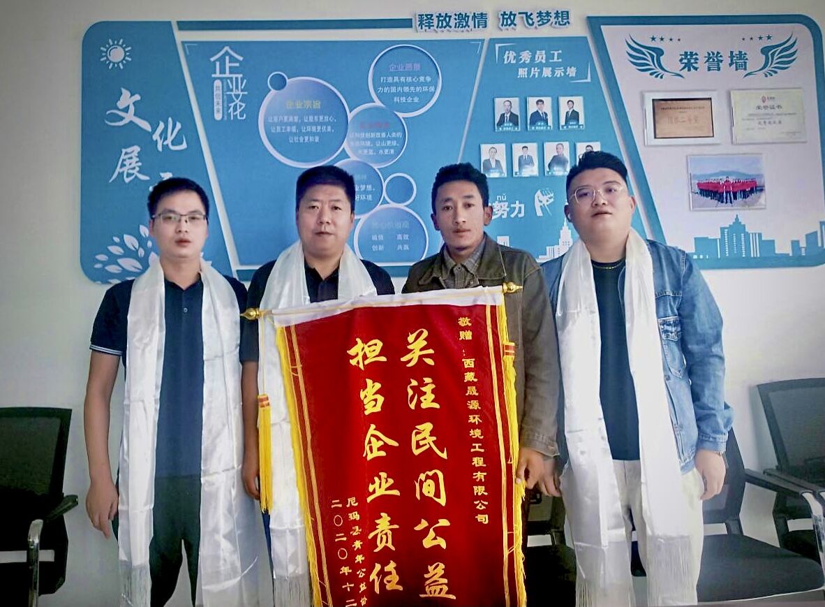 在捐贈(zèng)集儀式上,尼瑪縣青年公益協(xié)會(huì)代表益西尼布送上錦旗,感謝西藏晟源對(duì)那曲環(huán)保工作的支持。
