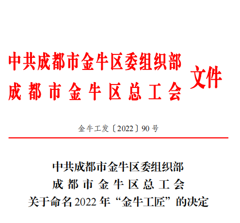 2022年12月2日,中共成都市金牛區委組織部成都市金牛區總工會發布《關于命名2022年“金牛工匠”的決定》,四川省天晟源環保股份有限公司(簡稱“天晟源環保”)王承俊、劉真、童賢清三人獲得“金牛工匠”認定。至此,天晟源環保已有5人獲得“金牛工匠”稱號認定。