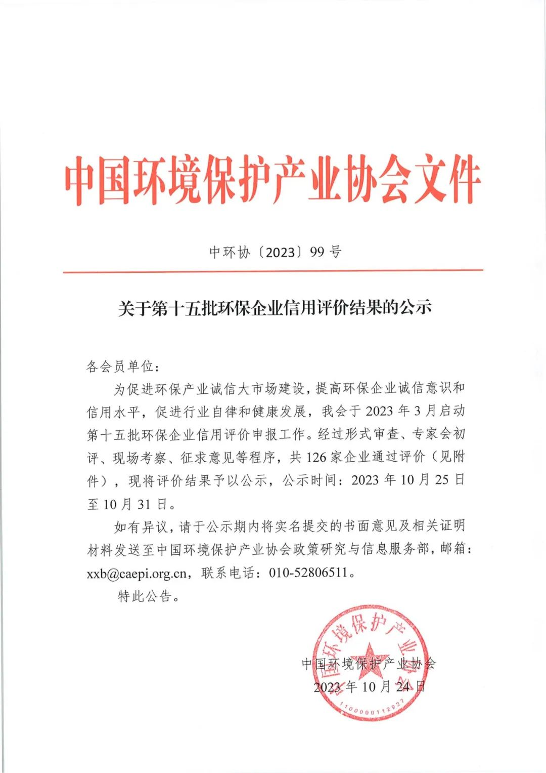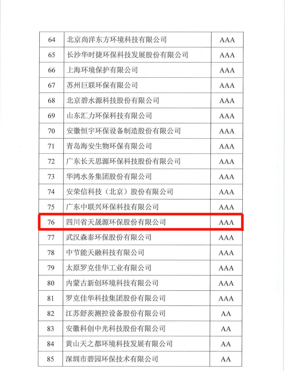 10月31日,在2023年中環(huán)協(xié)第十五輪環(huán)保企業(yè)信用評價中,四川省天晟源環(huán)保股份有限公司(簡稱:“天晟源環(huán)?!保┰俅螛s獲中國環(huán)保產業(yè)協(xié)會授予的“AAA級環(huán)保企業(yè)信用評價”榮譽。這是天晟源環(huán)保繼2020年首次獲得該項榮譽并期滿后,再次以優(yōu)秀的表現(xiàn)和扎實的環(huán)保業(yè)績獲得此項頂級評價。