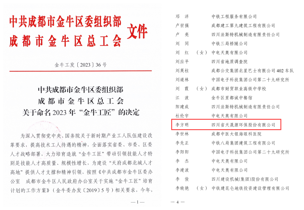 近日,中共成都市金牛區委組織部成都市金牛區總工會發布《關于命名2023年“金牛工匠”的決定》(金牛工發〔2023 ] 36號),四川省天晟源環保股份有限公司(簡稱“天晟源環保”)李方明榮獲“金牛工匠”榮譽稱號。