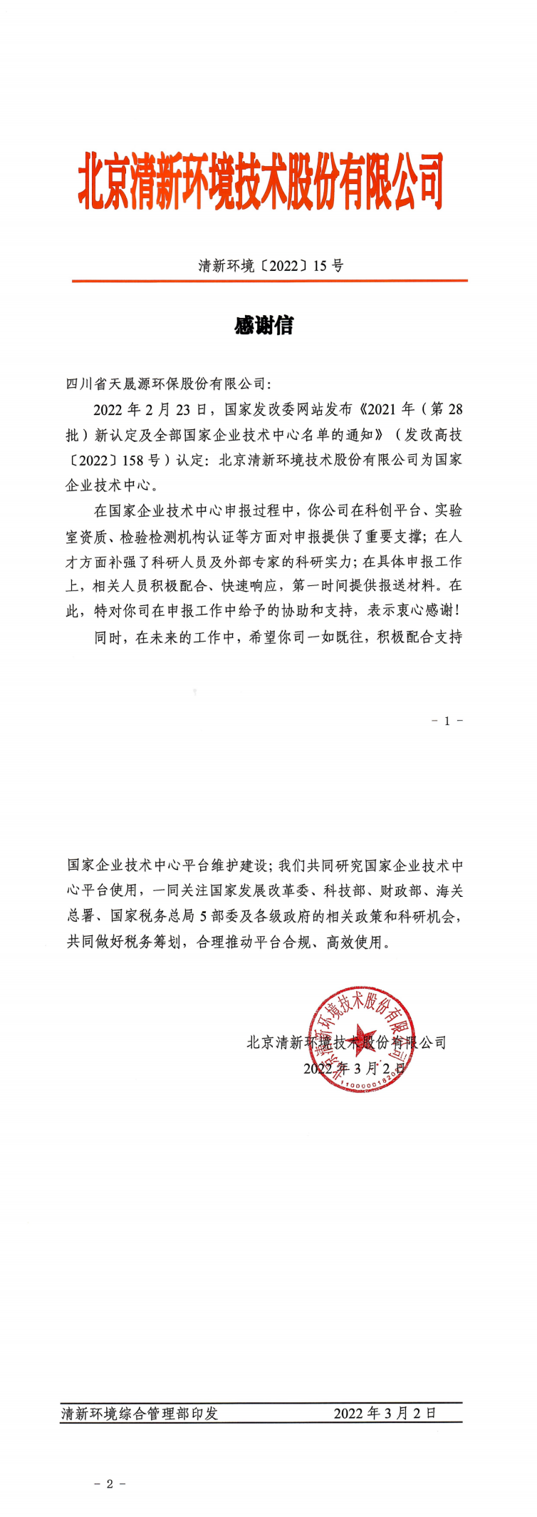 在清新環(huán)境技術(shù)中心申報(bào)認(rèn)定過程中,天晟源環(huán)保在科創(chuàng)平臺、實(shí)驗(yàn)室資質(zhì)、檢驗(yàn)檢測機(jī)構(gòu)認(rèn)證等方面對申報(bào)提供了重要支撐;在人才方面補(bǔ)強(qiáng)了科研人員及外部專家的科研實(shí)力;在具體申報(bào)工作上,相關(guān)人員積極配合、快速響應(yīng),第一時(shí)間提供報(bào)送材料。3月2日,清新環(huán)境特發(fā)來感謝信,向天晟源環(huán)保在申報(bào)工作中給予的協(xié)助和支持表示感謝。