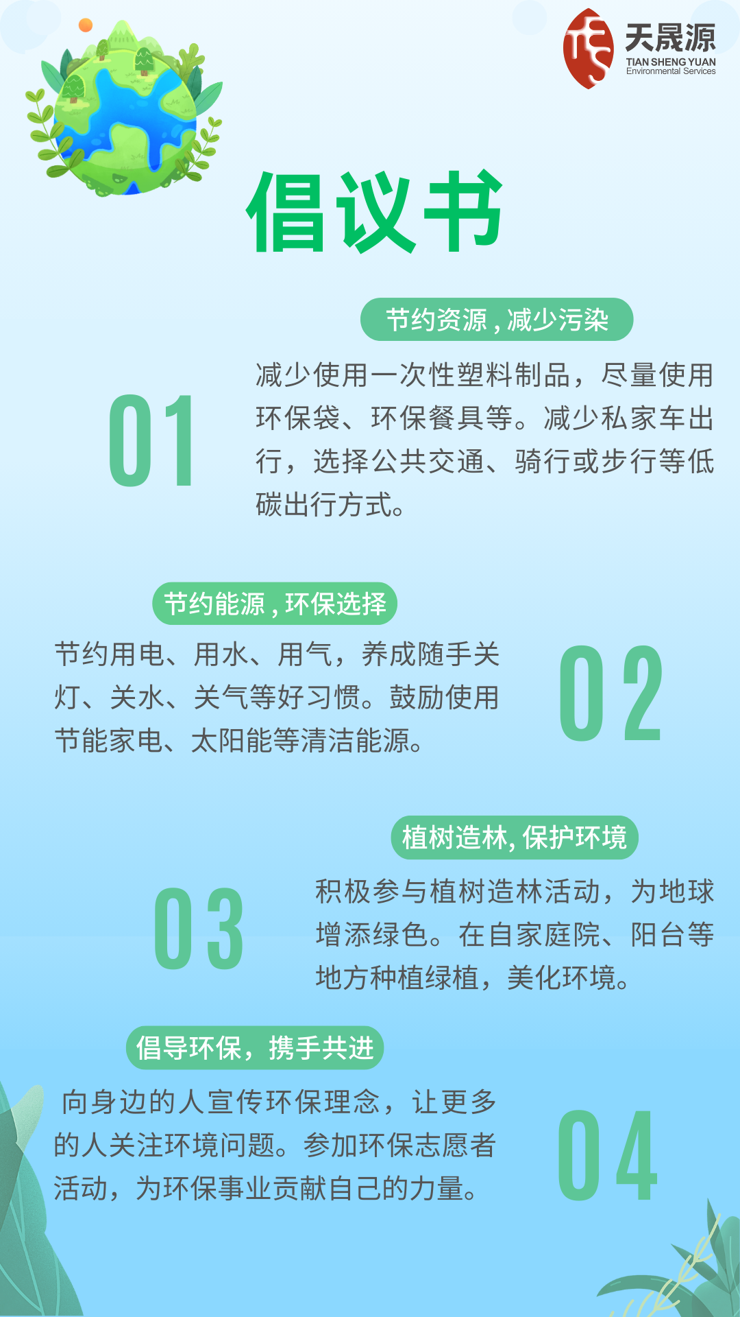 保護環境不僅是企業的責任,更是個人的責任,值此世界環境日之際,天晟源環保向全體員工及廣大公眾發出呼吁,從小事做起、從日常做起,共同為環境保護貢獻一份力量。具體倡議如下: