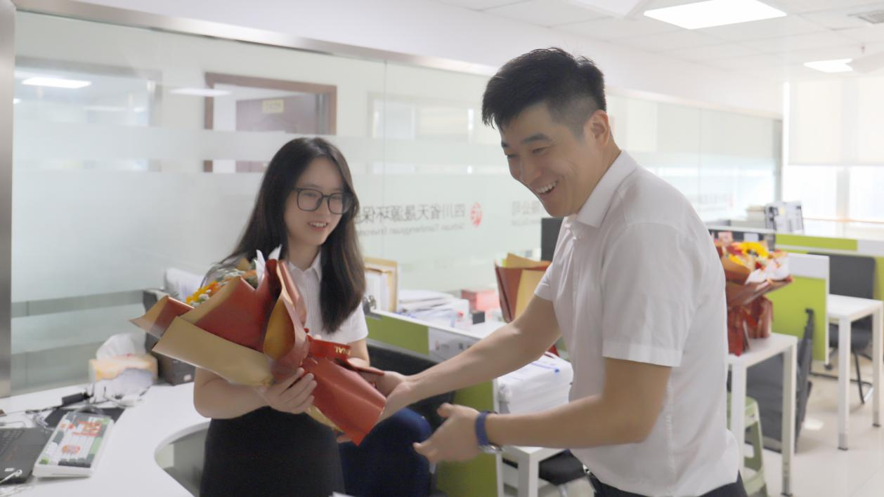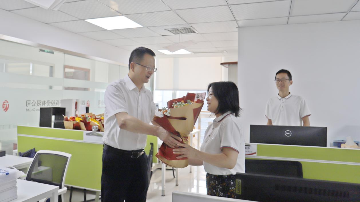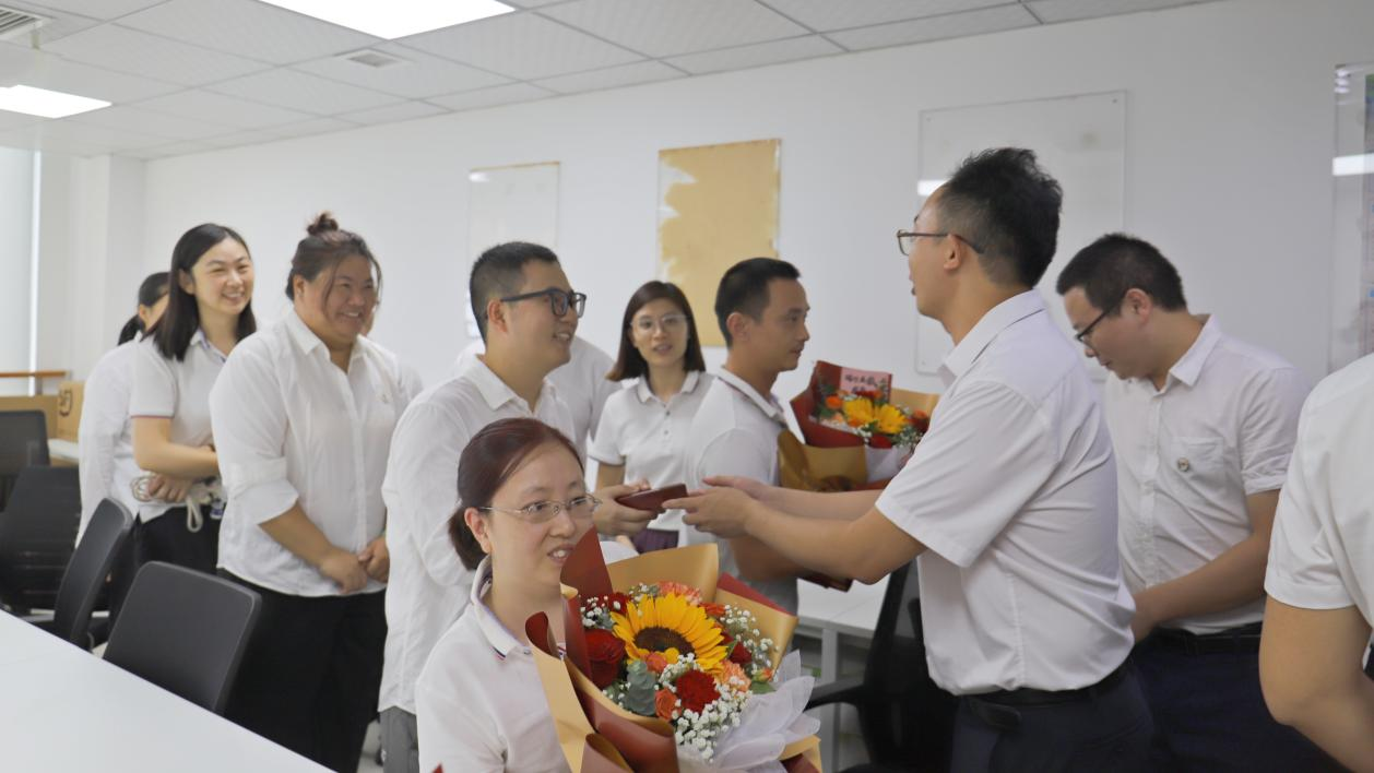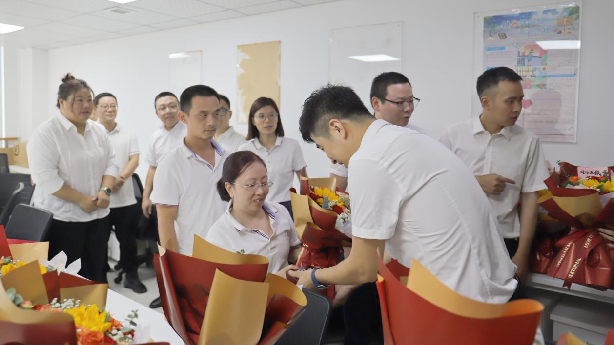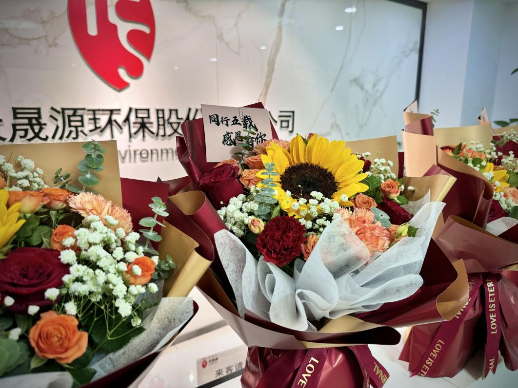 9月27日上午,天晟源環保主要領導李大有、張恒、姚夢代表公司向司齡滿九周年員工贈送與鮮花,向新滿五周年員工贈送紀念銀幣,一方面感謝他們的辛勤付出與忠誠堅守,另一方面勉勵他們再接再厲,在今后的工作中取得更好的成績。